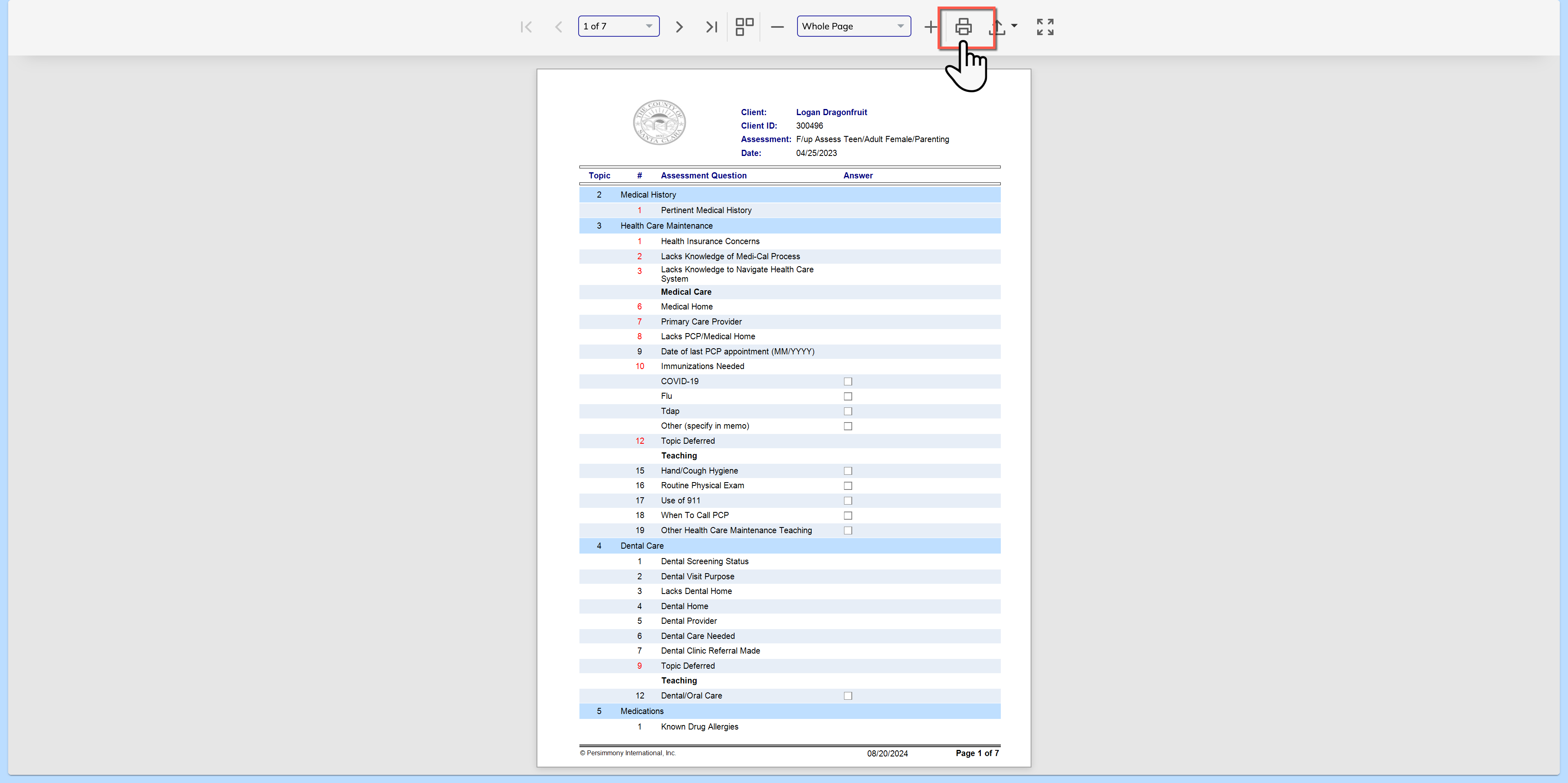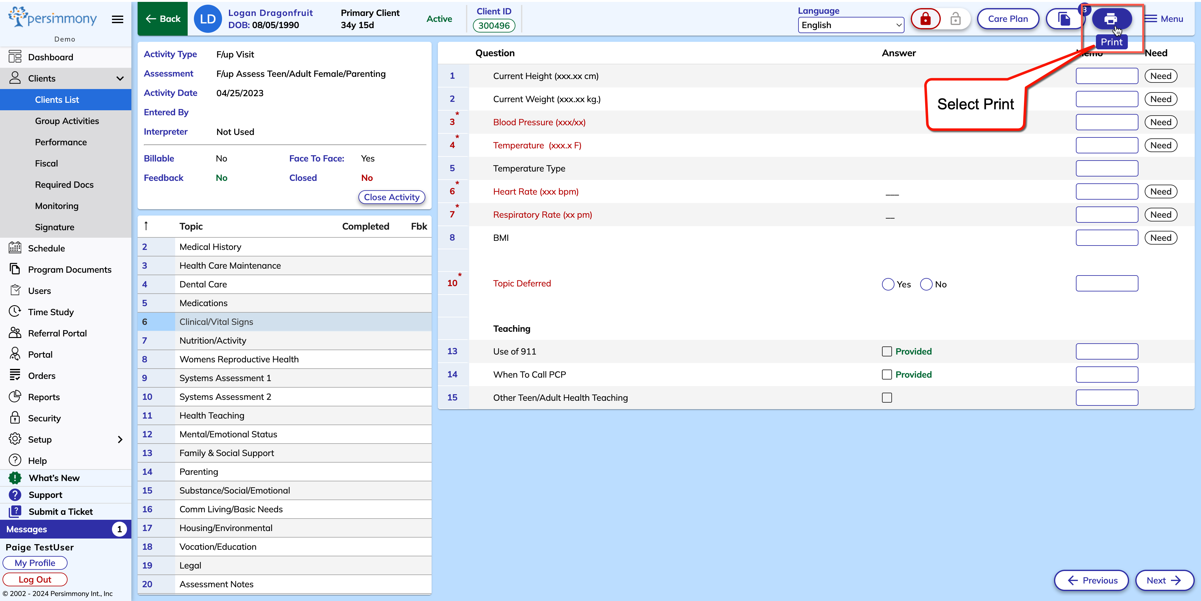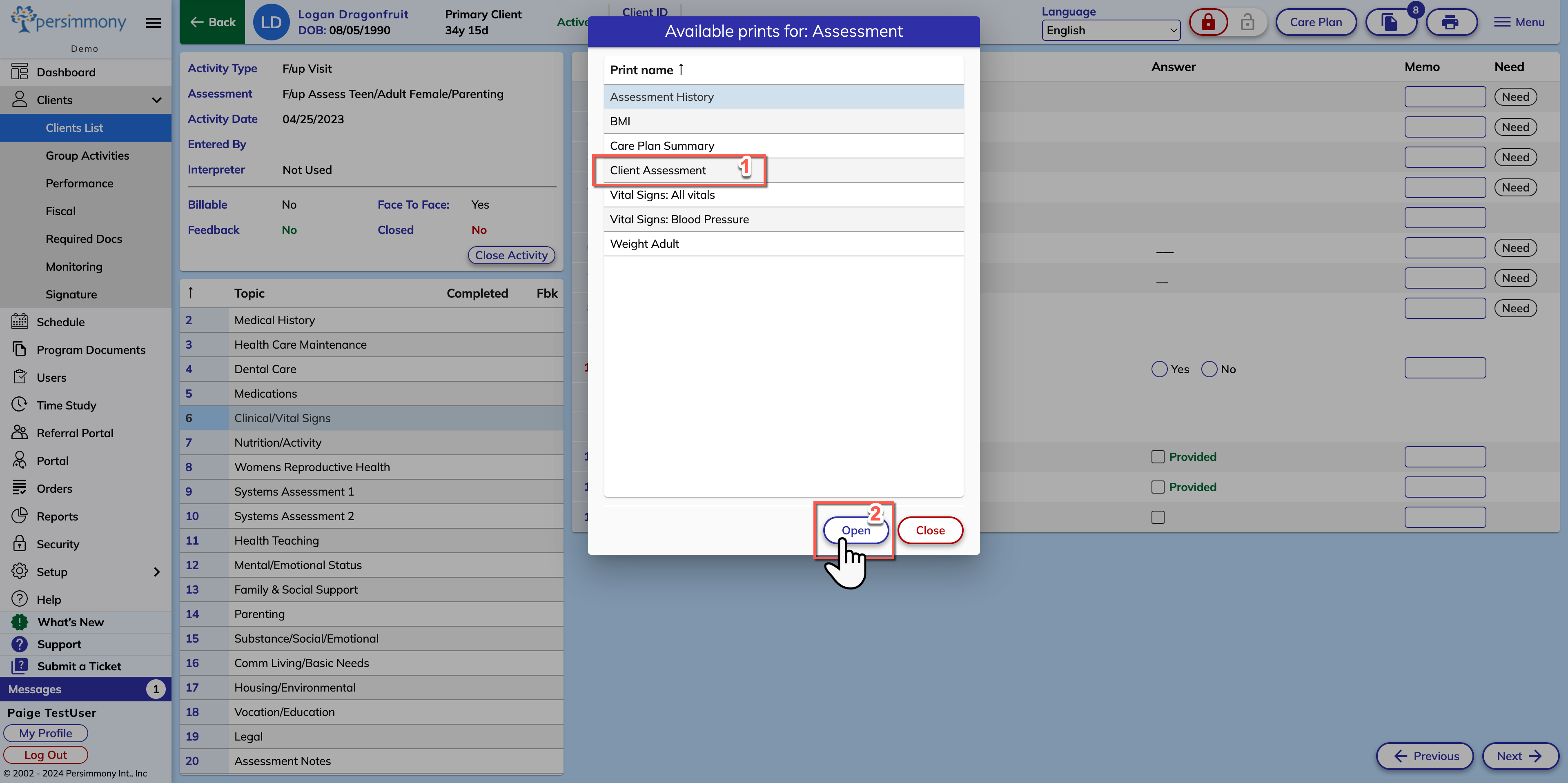 Assessments: How to Print Client Assessment or Questionnaire Instructions on how to print an assessment or questionnaire How to Print an Assessment Step 1: Within the client profile, open the activity that you wish to print Step 2: Select the Print Icon Step 3: Select Client Assessment Step 4: Select Open Optional: Change any settings prior to printing Step 5: Select the Print Icon & Select your printer