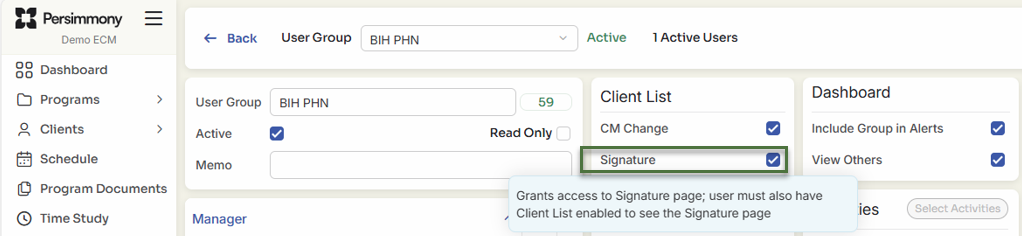 All users in that group will now have access to the Signature page under the Clients module.