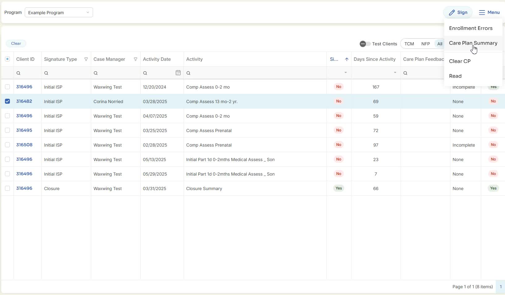 Once filters are set, the page will list all assessments requiring your signature for clients in the selected program(s).