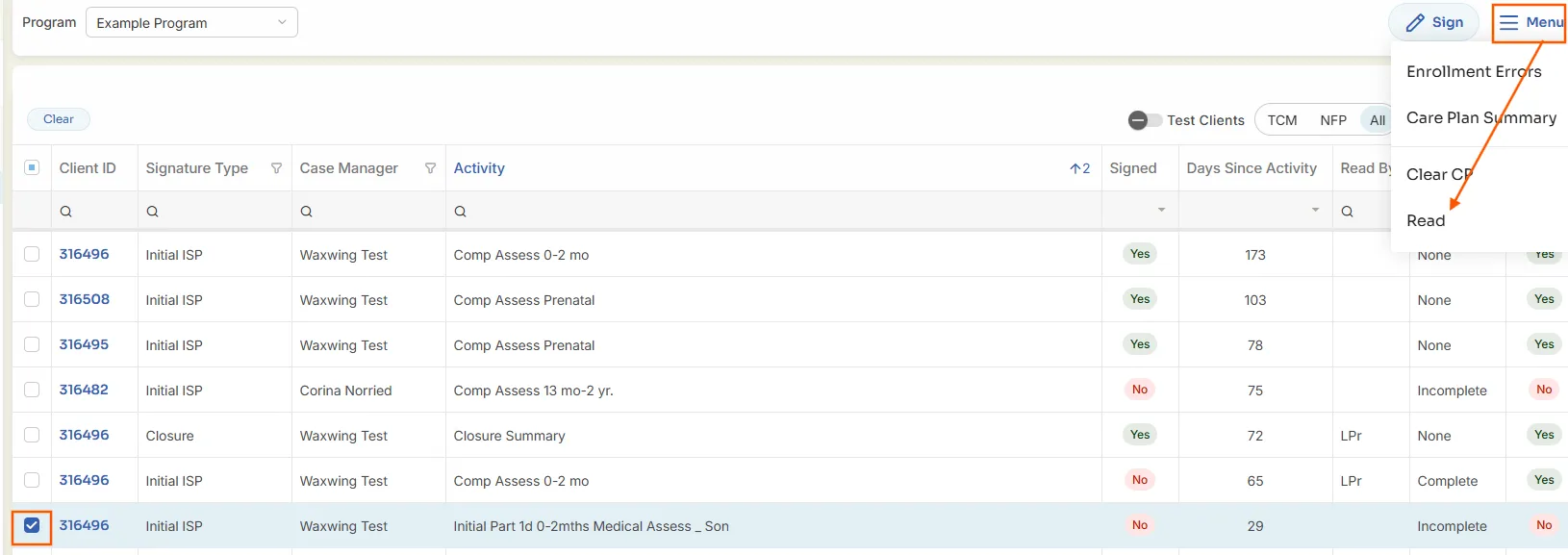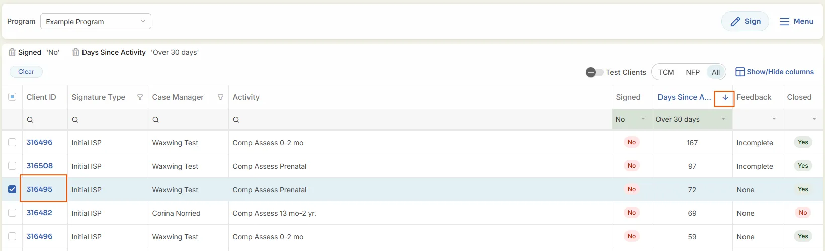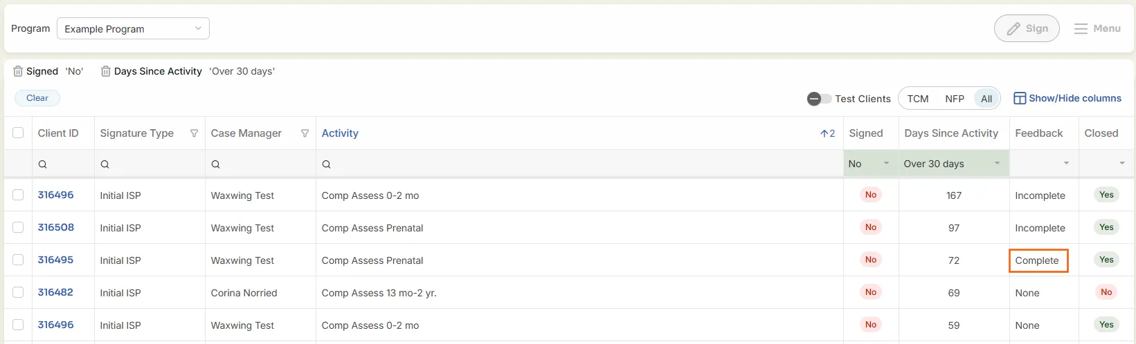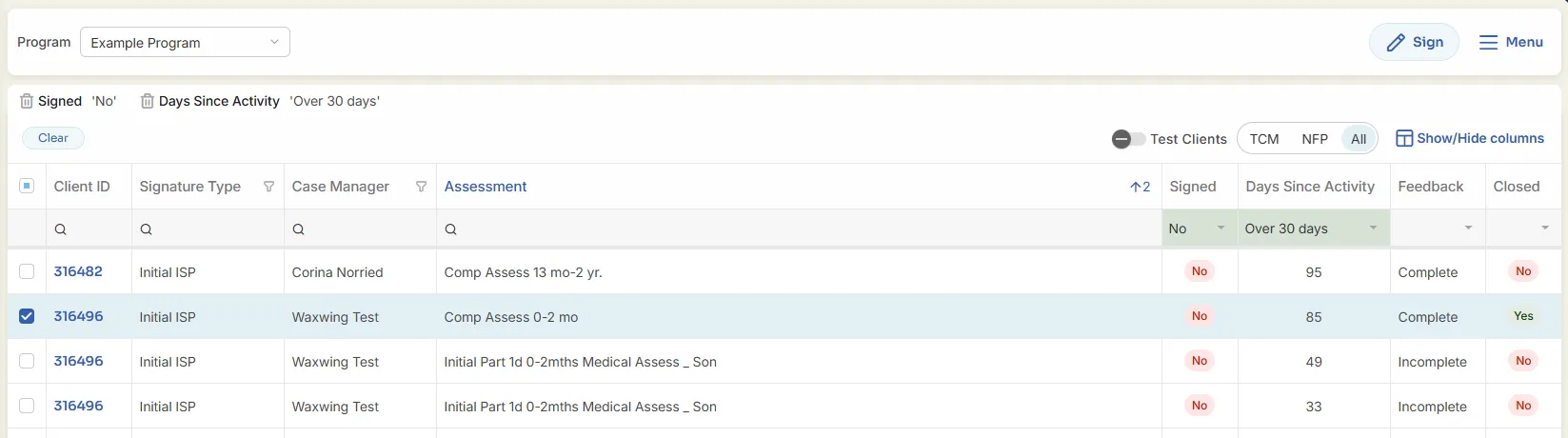 TCM-NFP-All Filter – Default is to show all assessments. Allows the user to filter out NFP Assessments (which usually are not signed) by selecting the TCM button.