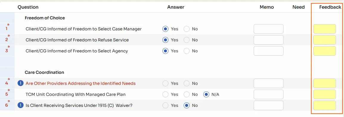 Yellow Feedback memos are also available for each Problem on the Care Plan. To access the client’s Care Plan, click the Care Plan button and it will open in a new tab allowing supervisors to tab between the assessment and Care Plan while providing feedback.