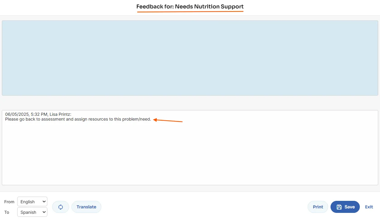 Note: Feedback is not stored permanently. Once an assessment is signed or Care Plan feedback is cleared, it cannot be recovered.