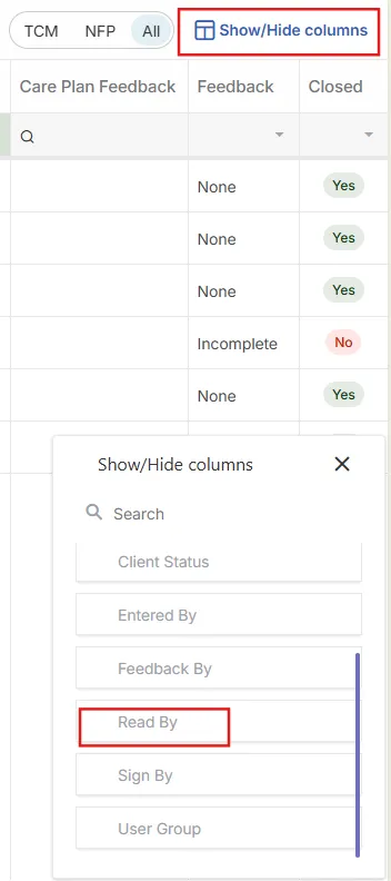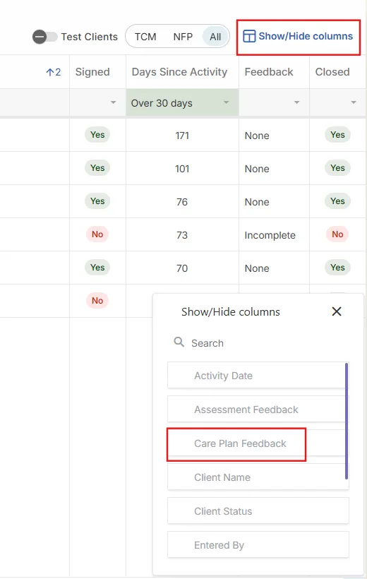 Since Assessment and Care Plan Feedback are separate, the process for clearing them is also separate. To clear Care Plan Feedback, use the Care Plan Feedback column. Depending on how the Signature screen is setup for your agency, the Care Plan Feedback column may be in the Show/Hide columns.