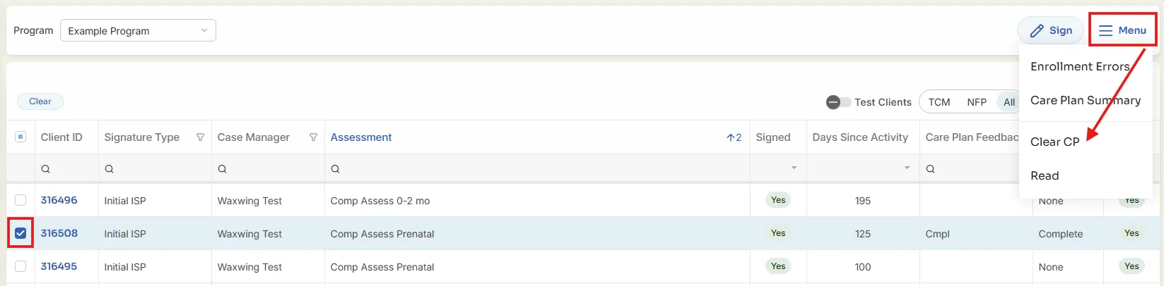 Clear CP – Deletes feedback on Care Plan.