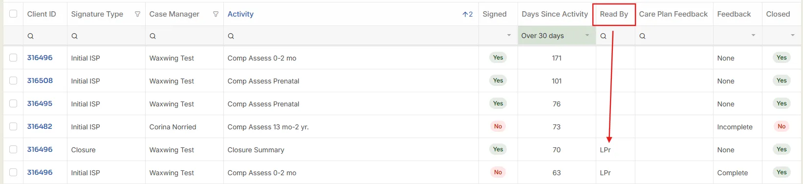 - If an assessment has been marked as read, the user's initials will be displayed in the Read By column